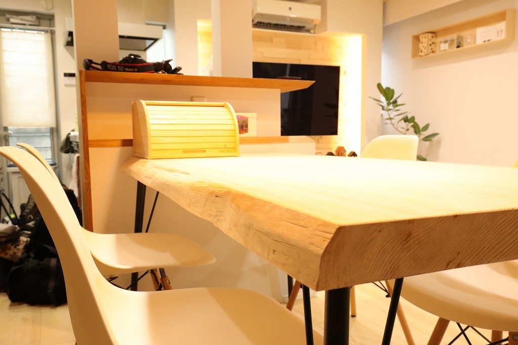 一枚板のテーブルは耳付き(端に木の皮が残った状態)