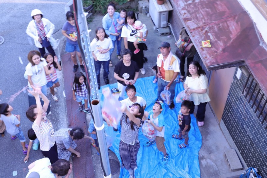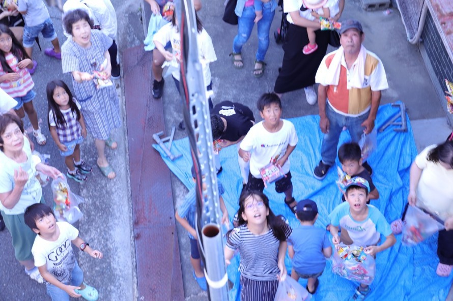 お菓子や小銭を屋根からまきます。