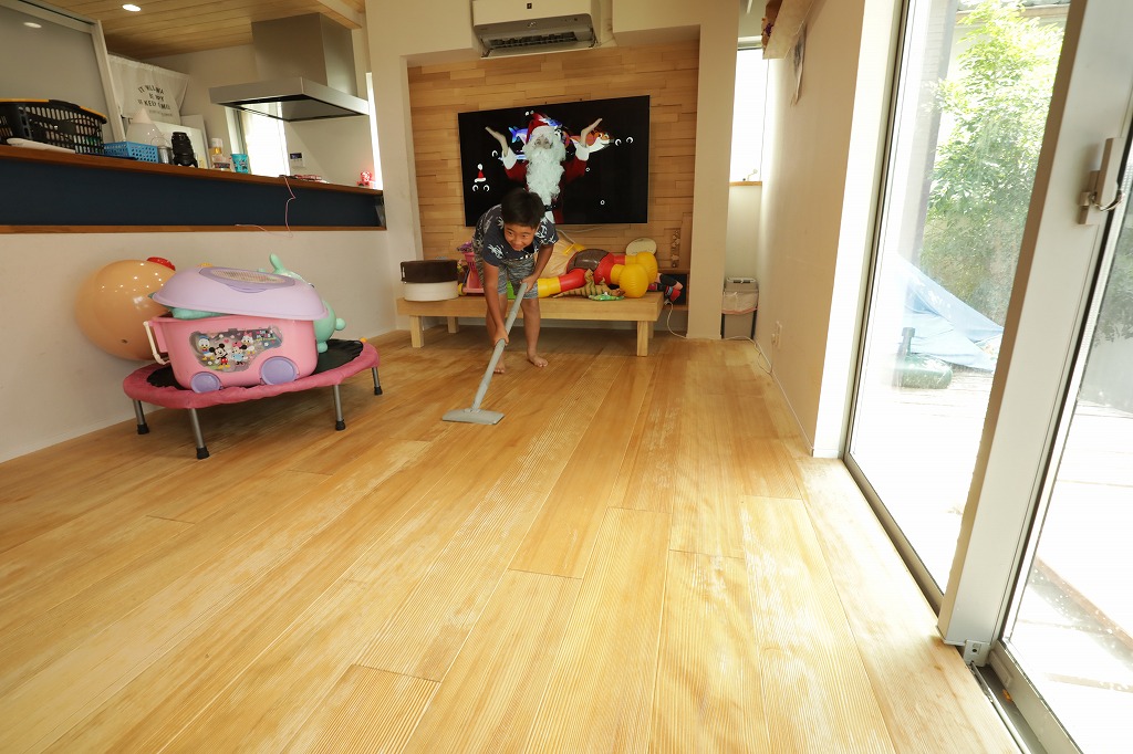 掃除機を当てた後、コップで水を撒いて水拭きです!