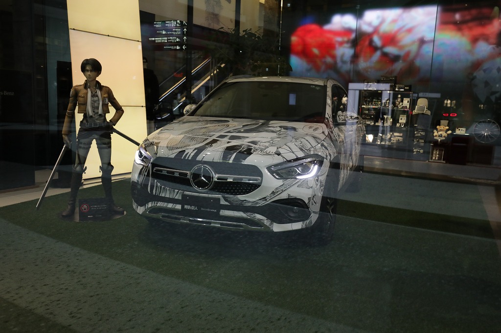 そしてすごい派手な車が展示されていました。進撃の巨人仕様のベンツですね。