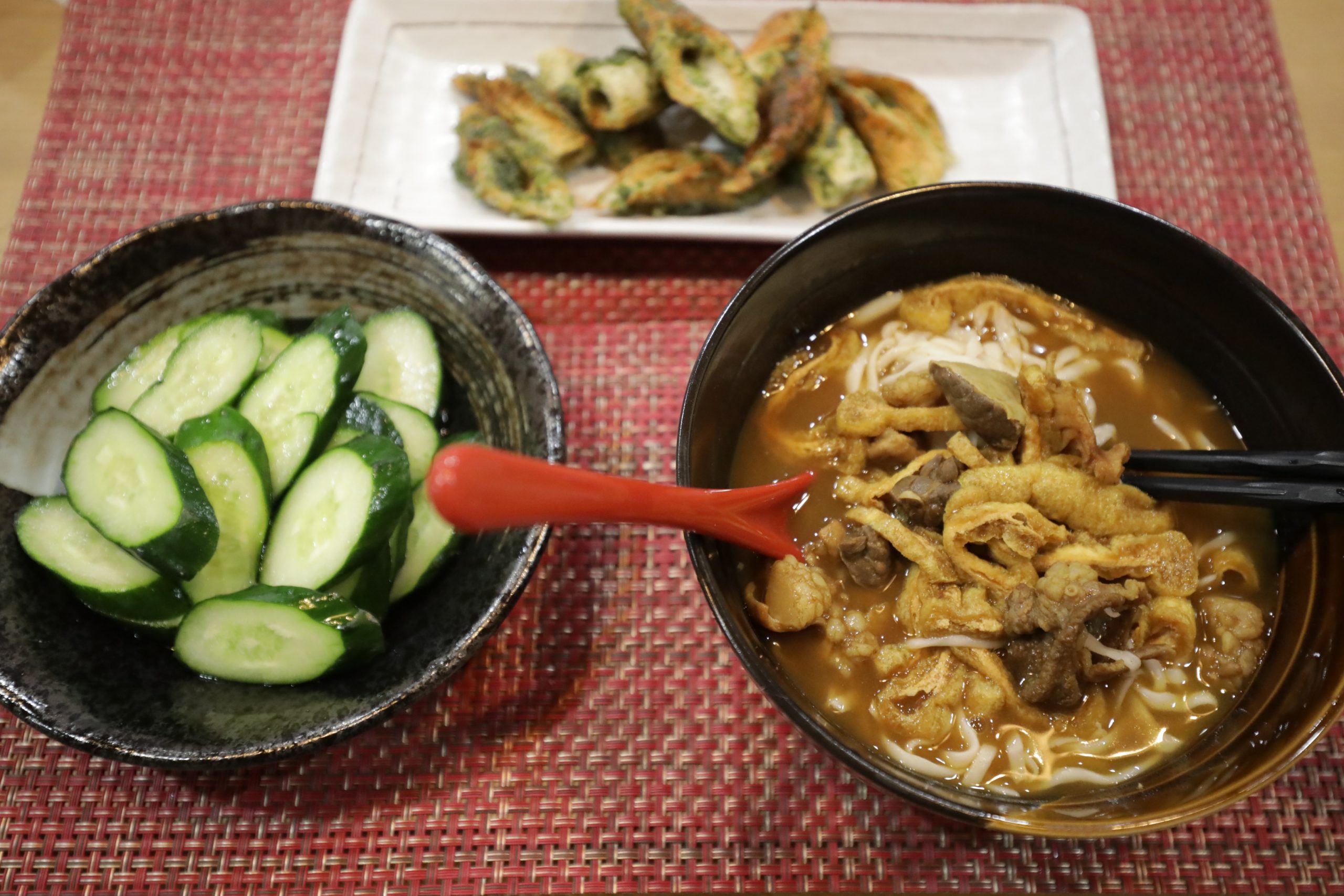 「カレーうどん」と「ちくわ」を揚げたやつ。ときゅうりの浅漬けです。