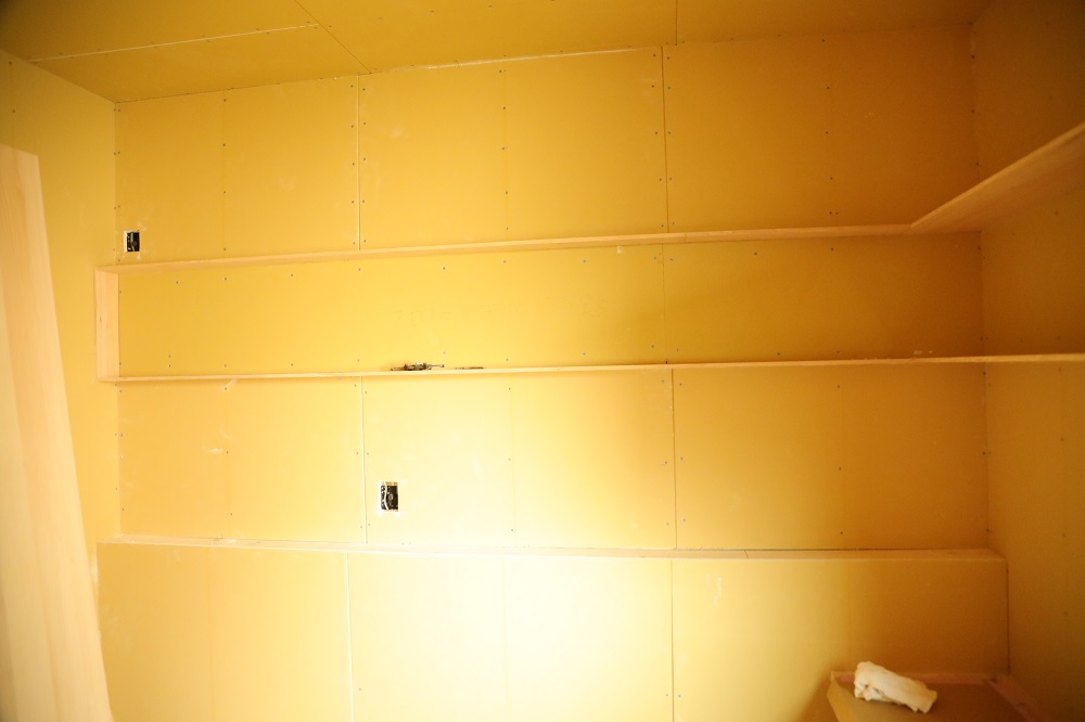 ここからカウンターなどを取り付けて、天井や壁にもみの木を貼っていきます。