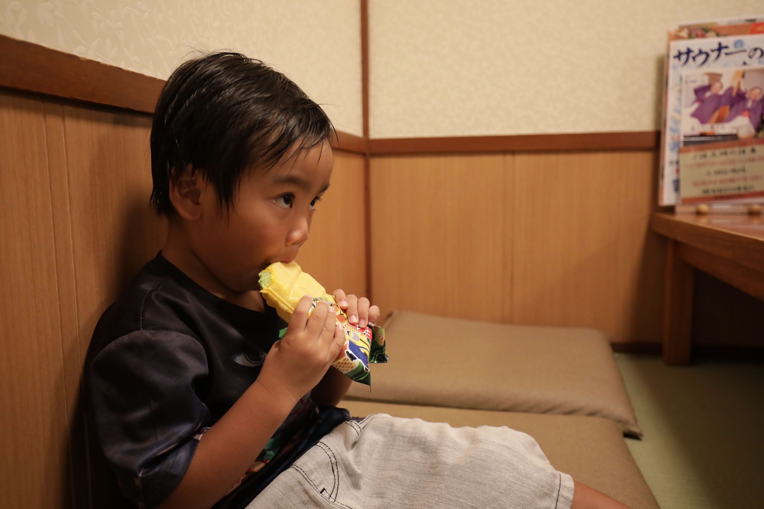 風呂を出て子供にアイスを食べさせます。