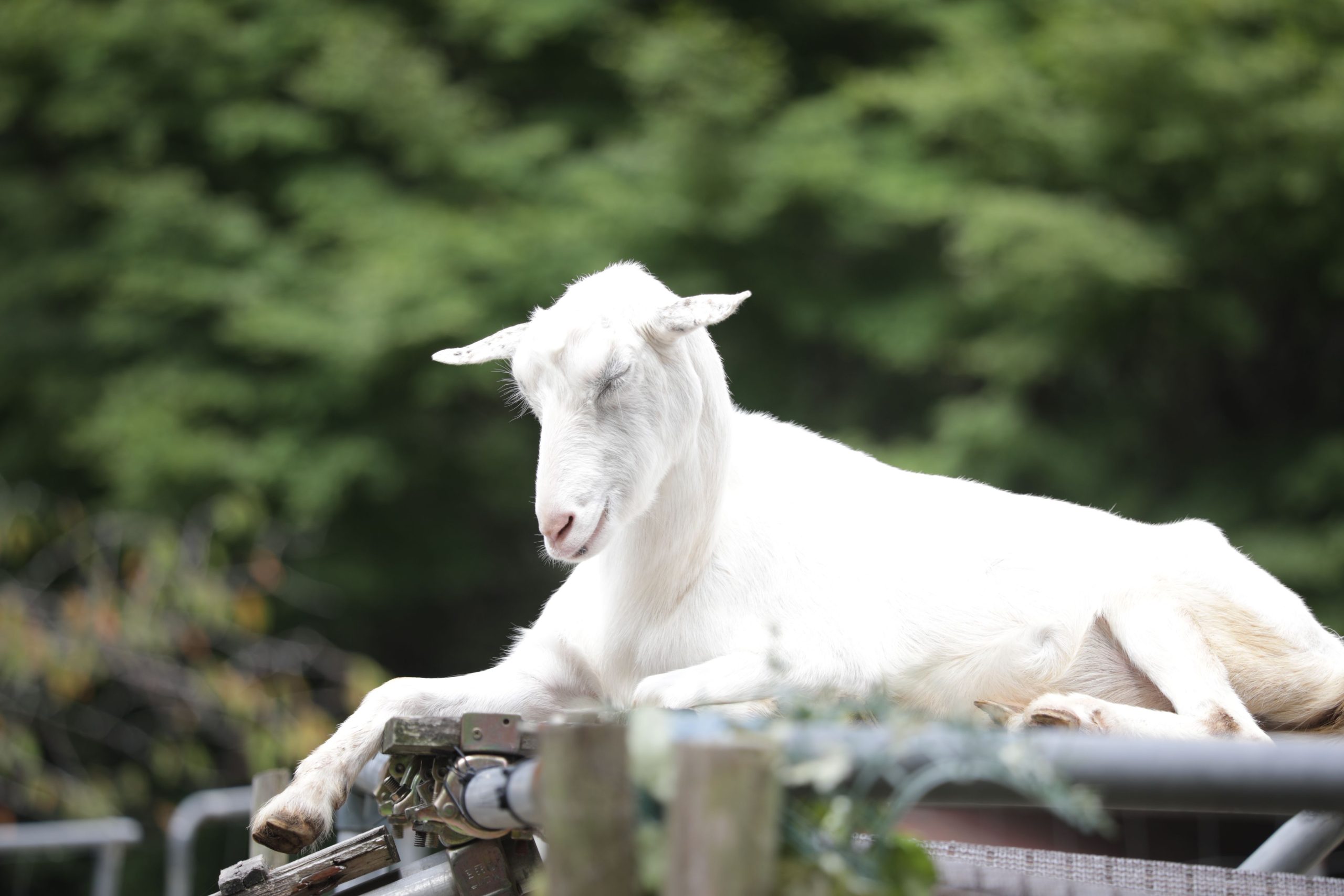 白いやぎがネットの上でくつろいでいます。
