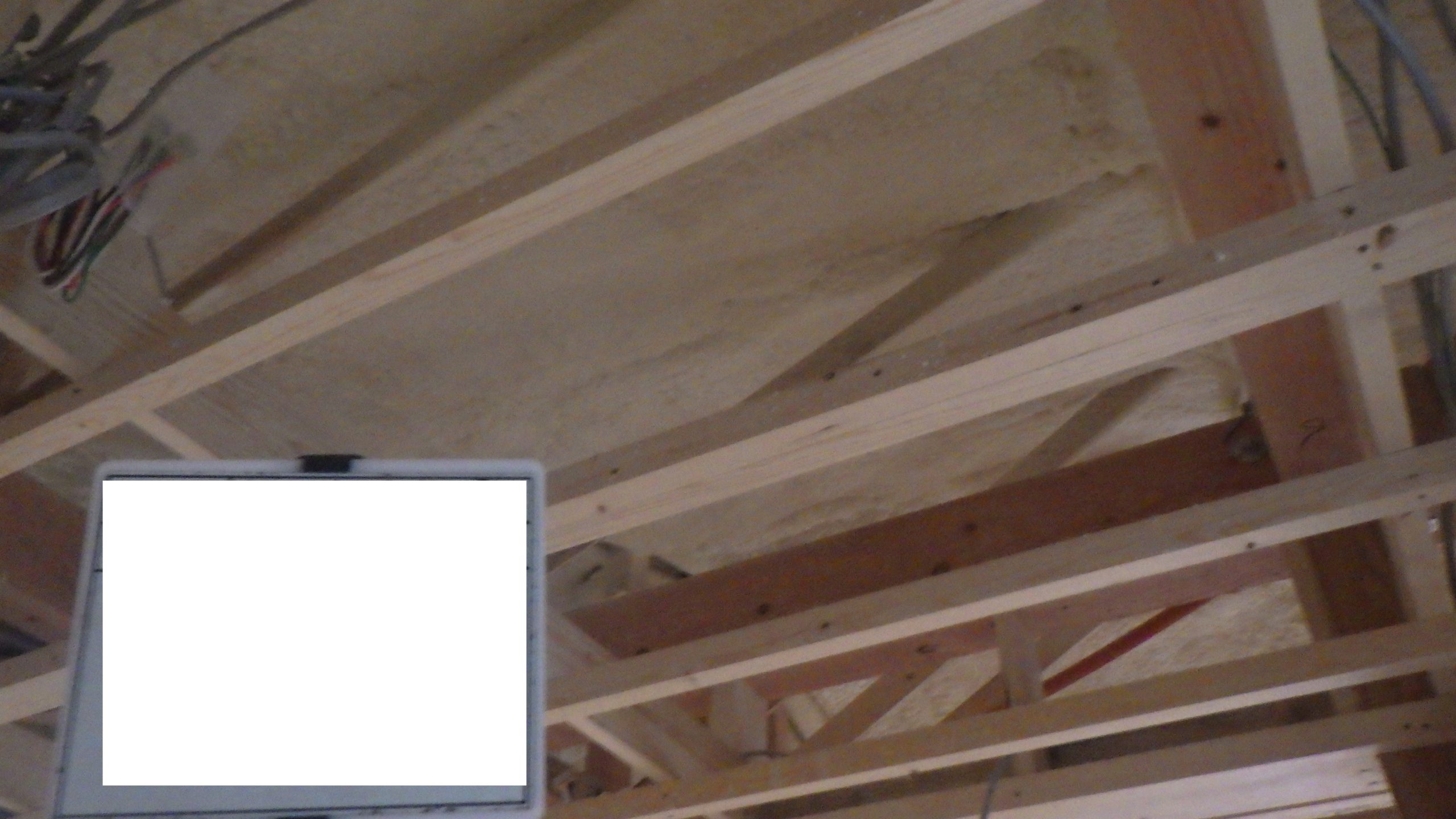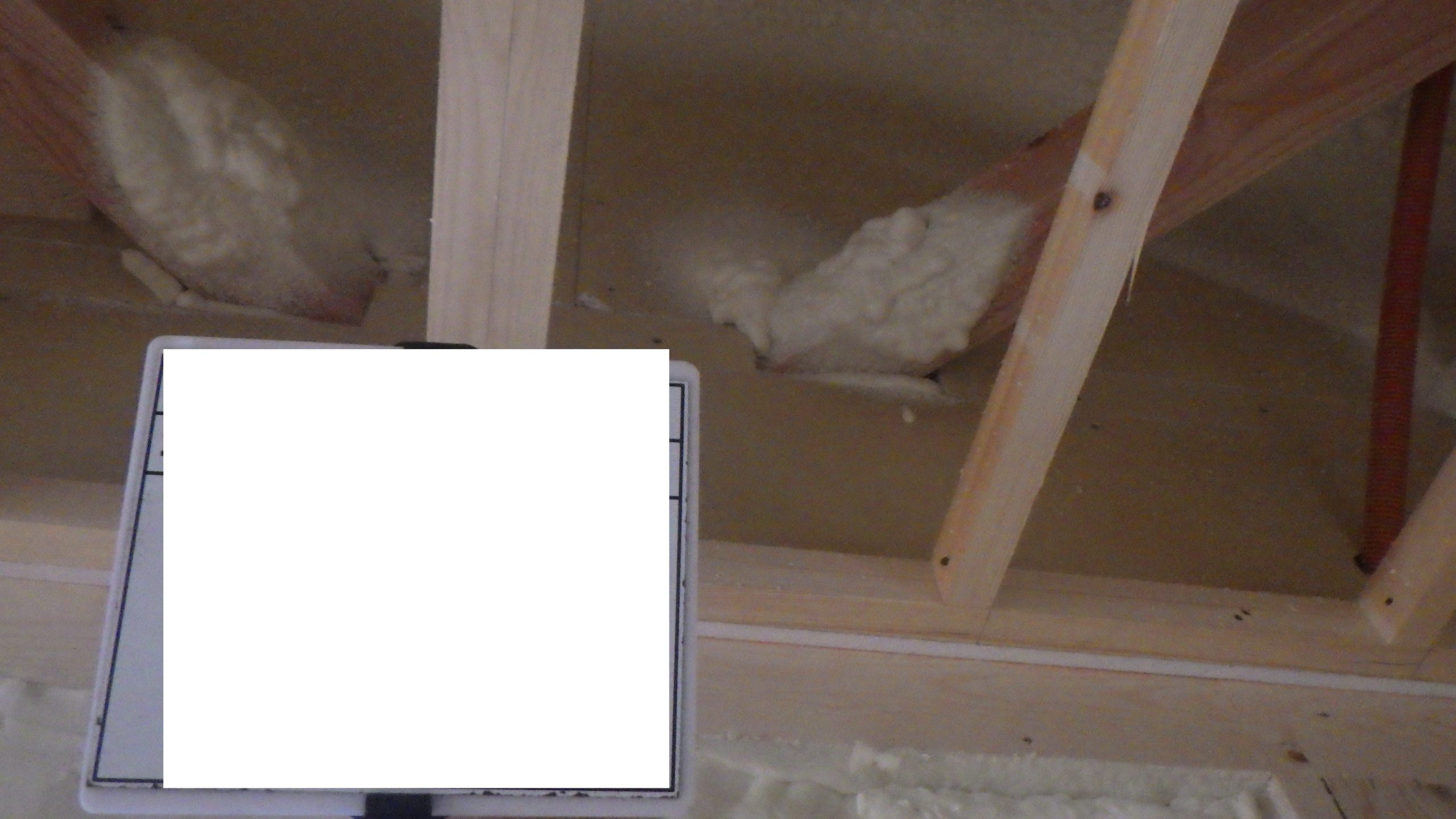 屋根裏と壁に白っぽい断熱材がもこもこと膨らんで家中をすっぽりと覆います。