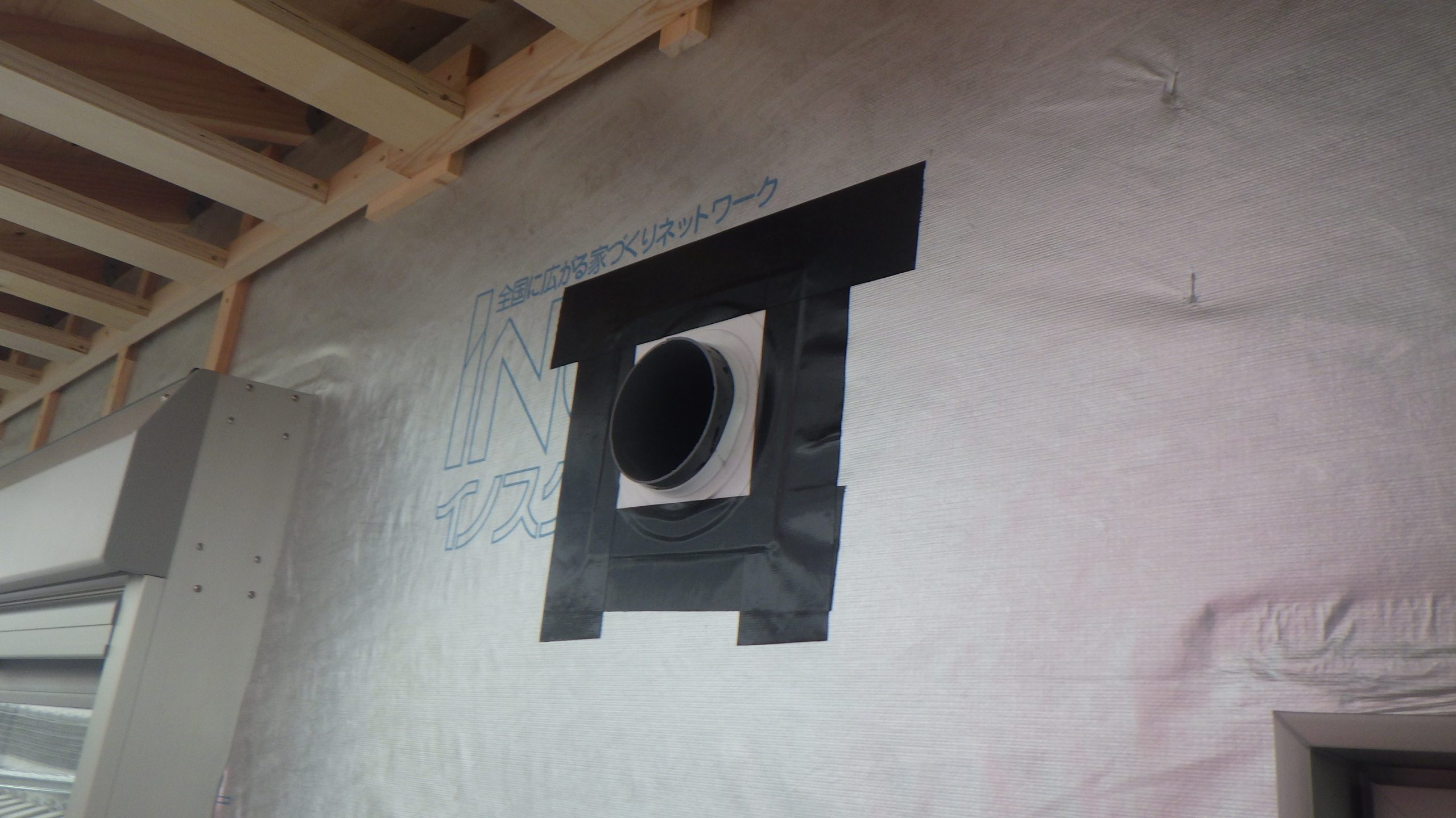 外部では透湿防水シートが張られ、配管や排気口などの孔を開けなければいけない部分は防水テープをしっかり貼りつけます。